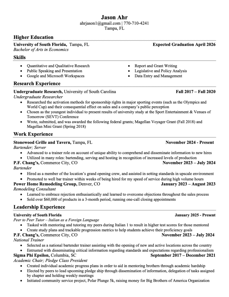 My Resume & Cover Letter You can view and download my current resume and cover letter below. I am currently seeking opportunities where I can apply my background in economics, data-analysis and policy to real-world problem solving. Download Resume